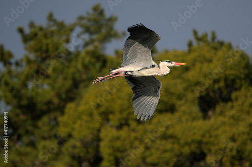 Obraz premium 大きな羽を広げて飛んで行くアオサギ