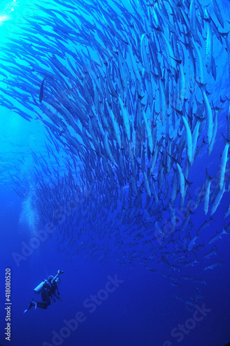 © Makoto, Naklejka premium バラクーダの群とダイバー