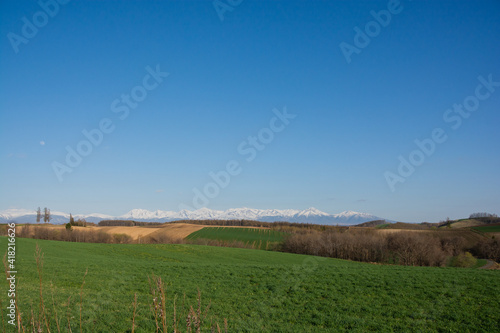 © kinpouge, Obraz premium 春の晴れた日の緑の牧草畑と残雪の山並み