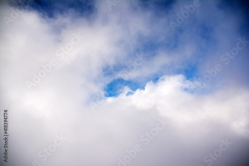 Obraz premium 信州北アルプス北穂高岳上空のふんわりした白い雲、晴れた青空。コットンキャンディ綿菓子。