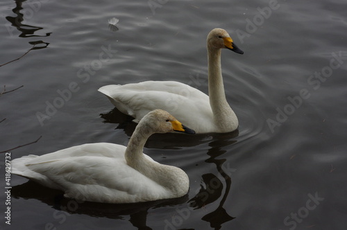 © Enriqecido, Fototapeta premium 厳しい寒さを避けて越冬で飛来地へと渡ってきた、美しい白い羽毛のオオハクチョウ