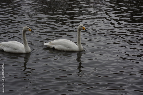 Naklejka premium 厳しい寒さを避けて越冬で飛来地へと渡ってきた、美しい白い羽毛のオオハクチョウ