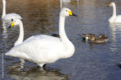 © Enriqecido, Obraz premium 厳しい寒さを避けて越冬で飛来地へと渡ってきた、美しい白い羽毛のオオハクチョウ