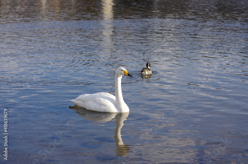 Naklejka premium 厳しい寒さを避けて越冬で飛来地へと渡ってきた、美しい白い羽毛のオオハクチョウ