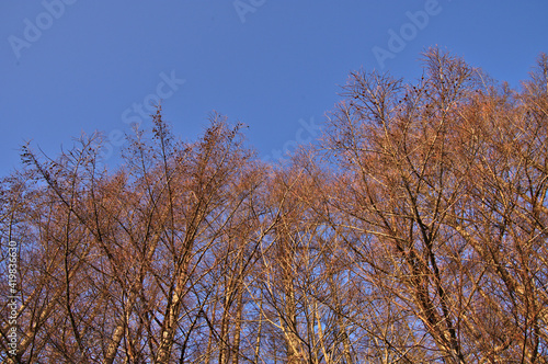 Fototapeta premium 青空を背景にした葉の無いカラマツ林。