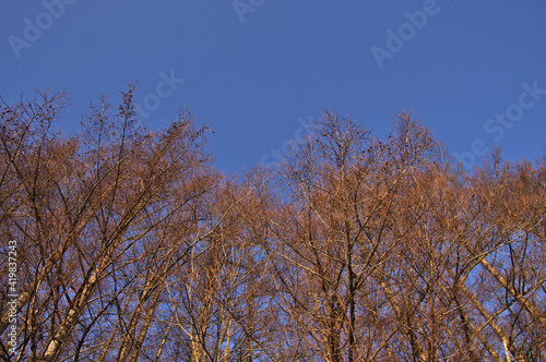 Fototapeta premium 青空を背景にした葉の無いカラマツ林。