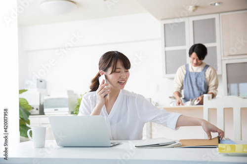 Obraz premium リモートワーク 女性 夫婦 テレワーク