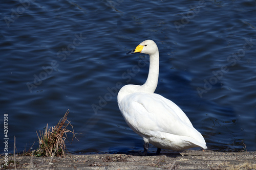 Fototapeta premium 北帰行に備えて、ゆっくり休んでいるオオハクチョウ。日向ぼっこ。日本。千葉県。2021年3月。