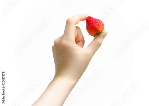 © kaori, Obraz premium イチゴを持つ手 アップ 白色の背景