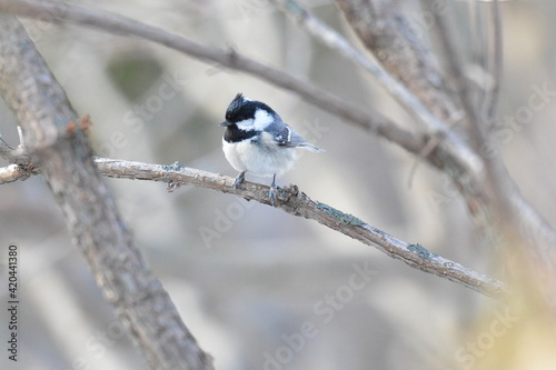 Naklejka premium 真冬の北海道の森の中、囀るヒガラ
