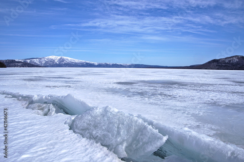 Obraz premium 氷に覆われた晩冬の屈斜路湖。