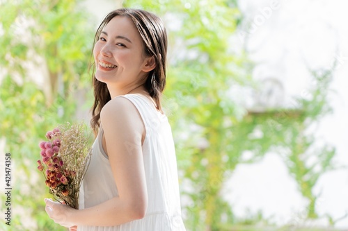 © ponta1414, Naklejka premium お花を持った若い日本人女性 ポートレート