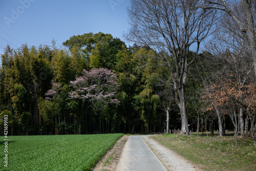 Fototapeta premium 桜の木と藪 一本道