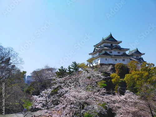 Fototapeta premium 快晴の青空と史跡和歌山城を背景にした桜(ソメイヨシノ)の花がある春の風景(コピースペースあり)