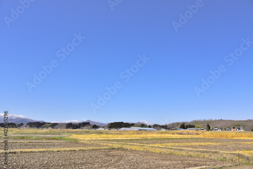 © rujin, Obraz premium 宮城の田園、春を待つ里山から雪の蔵王を望む