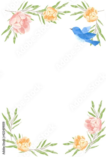 Fototapeta premium 優しいタッチの幸せを運ぶ青い鳥と薔薇とユーカリのフレーム