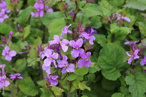 Naklejka premium 早春の花壇に咲くムラサキハナナの紫色の花