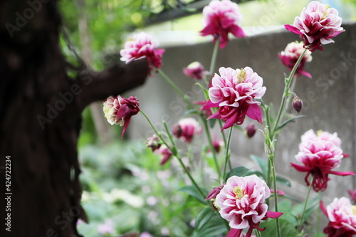 Obraz premium 初夏の半日陰の庭 満開の西洋オダマキ レッドホワイト