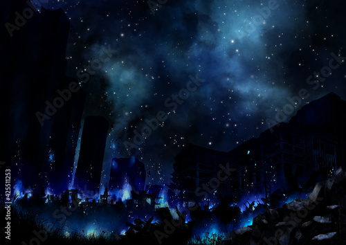 © nijin, Obraz premium 夜に星空の下で青い炎で燃える廃墟の街