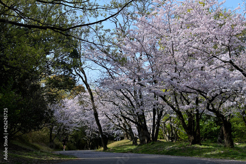 © FUJIOKA Yasunari, Obraz premium 朝日を浴びる満開の桜並木と、遊歩道に散った桜の花びらが見える公園の風景