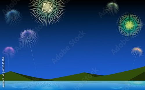 Obraz premium アウトドアでの花火のイメージ、山と湖畔、夏素材