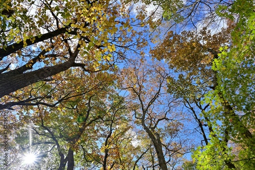 © Scott Mirror, Fototapeta premium 青空バックに見上げるカラフルな朴葉の黄葉情景@奥入瀬渓流、青森