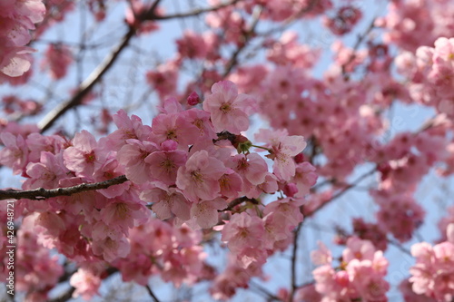 Obraz premium 早春の日本の公園に咲く河津桜(早咲き桜)のピンクの花が青空に映える様子