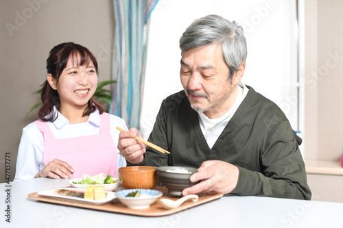© koumaru, Obraz premium 食事をする高齢者男性とエプロン姿の女性介護士