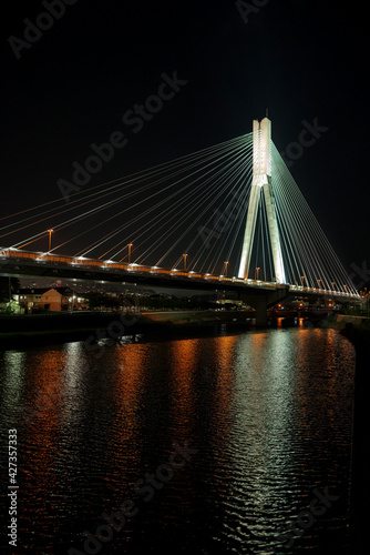 © satoru, Fototapeta premium 大阪府池田市と兵庫県川西市の県境、夜の猪名川と阪神11号池田線新猪名川大橋・ライトアップされたビッグハープ