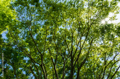 Obraz premium 生き生きとした木の葉の間から見える輝く太陽と青い空
