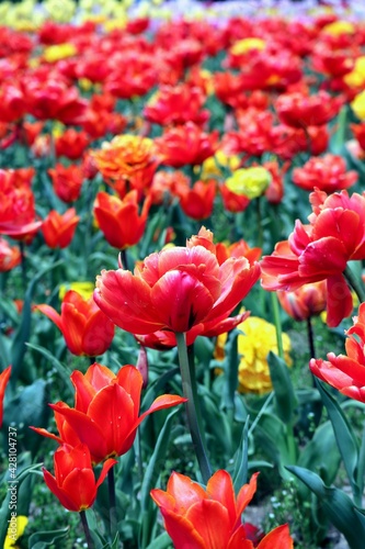 © masamasa3, Obraz premium 日本の観光地の美しいチューリップガーデンのクローズアップ