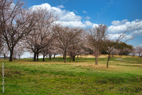 Obraz premium 快晴の春の日に、広大な公園でお花見