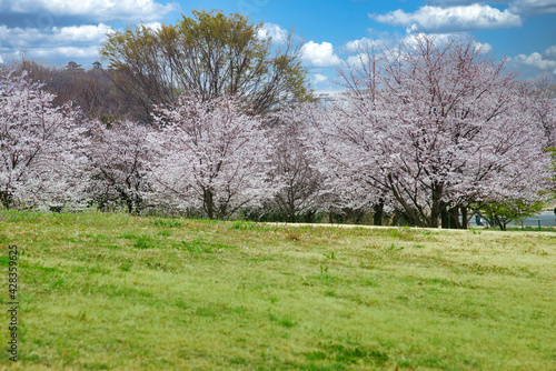 Obraz premium 快晴の春の日に、広大な公園でお花見