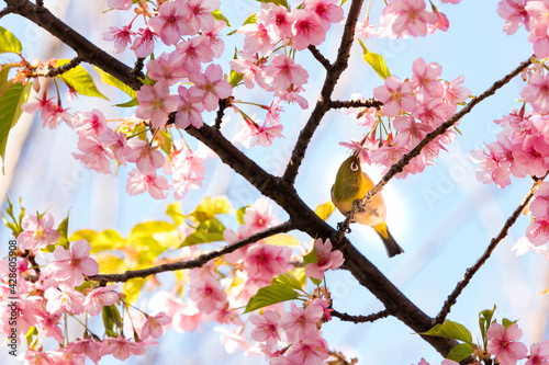Obraz premium 河津桜とメジロ 千葉県市川市 日本