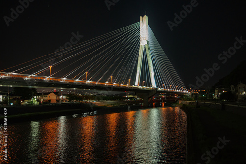 © satoru, Fototapeta premium 大阪府池田市と兵庫県川西市の県境、夜の猪名川と阪神11号池田線新猪名川大橋・ライトアップされたビッグハープ
