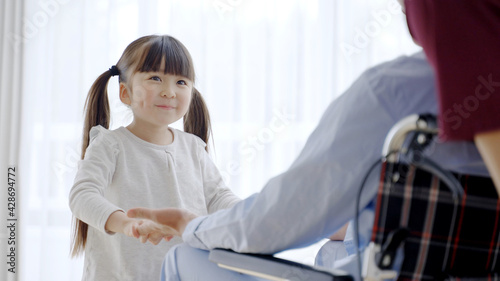 Obraz premium 車椅子に乗ったおじいちゃんと孫娘