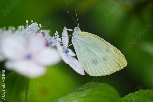Naklejka premium 紫陽花にとまるモンシロチョウ