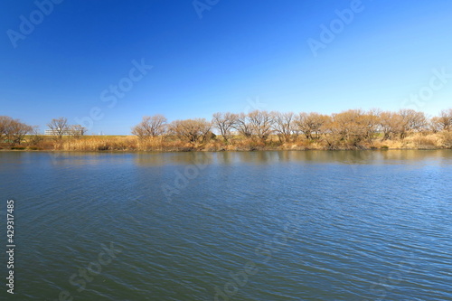 Obraz premium 冬の朝の風のある江戸川風景