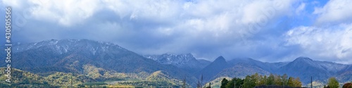 Obraz premium 雪山と紅葉のパノラマ情景@北海道