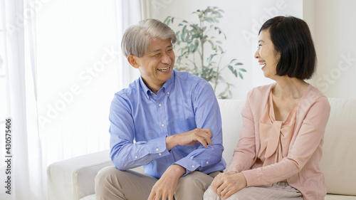 © polkadot, Obraz premium リビングで笑顔で話す中高年夫婦