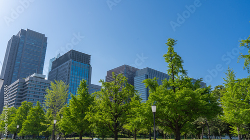 © aomas, Obraz premium 高層ビルと街路樹と青空の風景。日本、東京都千代田区。