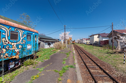 Obraz premium 【青森県五所川原市金木町】本州最北私鉄津軽鉄道嘉瀬駅プラットホームの景色