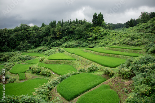 © yonyonmiyon, Fototapeta premium 稲生い茂った緑の棚田