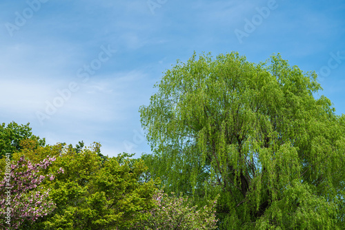 © kikisora, Obraz premium 拾ヶ堰の新緑 八重桜と桜と柳