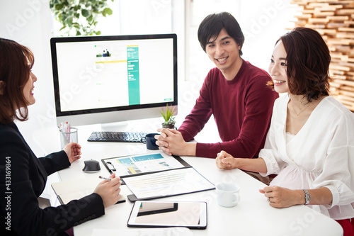 © Monet, Fototapeta premium 女性保険セールスの提案を聞く若い夫婦