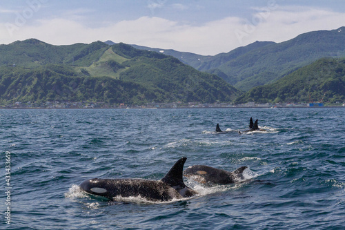 Fototapeta premium 【北海道】知床の海に回遊する野生のシャチ(北海道羅臼沖)