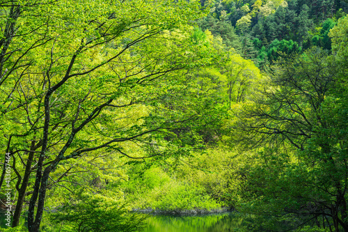 Obraz premium 深い新緑の森と水面