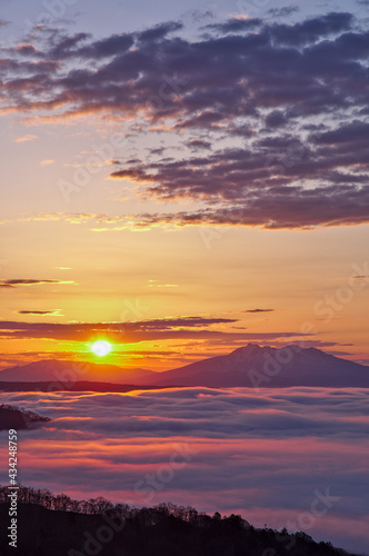 Obraz premium 輝く朝陽の下に雲海の広がるドラマチックな夜明け。日本の北海道の美幌峠。