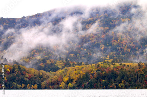 © Saitan, Fototapeta premium 霧が立ち込める阿寒湖の原生林の紅葉