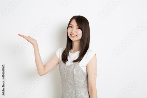 Fototapeta premium 手をあげて笑顔で案内をしている若い女性